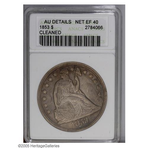1853 S$1 --Cleaned--ANACS. AU Details, Net XF40. A rich 1853[S$1]--Cleaned--ANACS. AU Details, Net X