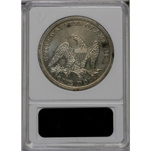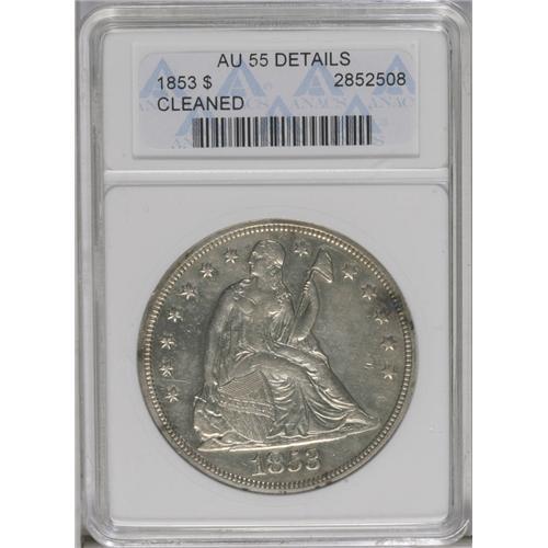 <B>1853<img border='0' src='http://www.heritagecoins.com/images/star.gif' width=10 height=10>$1>--Cleaned--ANACS. AU55 Details.</B></I> A sharp No Motto Seated dollar with only slight wear on highpoints such as Liberty's hair, chest, and thighs. The glossy fields are unnaturally prooflike. Lightly retoned in tan shades with the occasional small dark blue spot. Minor scratches are noted near OF, and the reverse rim has a hidden scrape near 7:30.