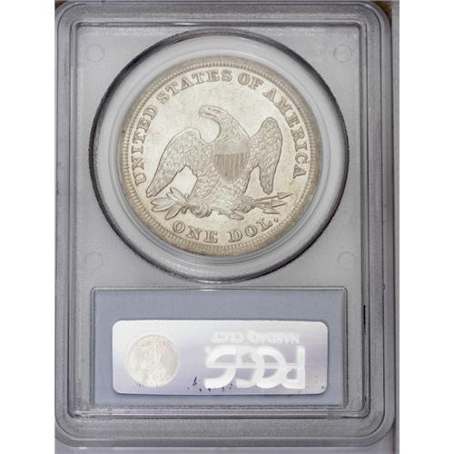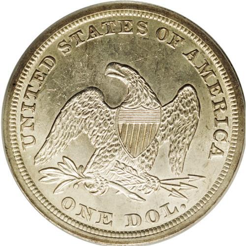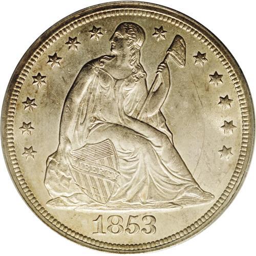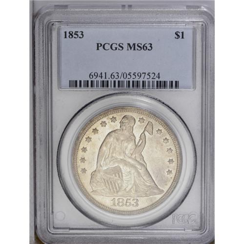 <B>1853<img border='0' src='http://www.heritagecoins.com/images/star.gif' width=10 height=10>$1> MS63 PCGS.</B></I> The 1853 is the most easily obtainable P-mint Seated dollar from the 1850s. Silver dollar specialists believe while many of the 46,110 pieces produced this year were exported, a decent number of coins were probably retained within the borders of the United States. When compared to most Morgan and Peace dollars, the 1853 is a significant rarity, particularly in the finer Mint State grades. This lightly toned example exhibits soft golden-gray shades that highlight the bold overall impression. There are a few abrasions in the fields on each side, the most significant of which is a curving mark on the right side of the obverse. Population: 26 in 63, 10 finer (2/06).
