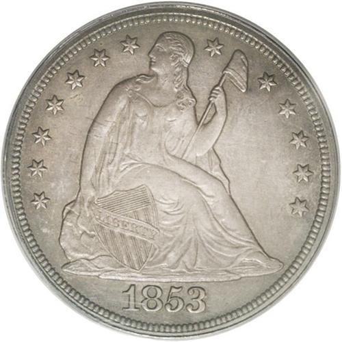 <B>1853<img border='0' src='http://www.heritagecoins.com/images/star.gif' width=10 height=10>$1> MS63 PCGS.</B></I> The 1853 is the most easily obtainable P-mint Seated dollar from the 1850s. Silver dollar specialists believe that, while many of the 46,110 pieces produced this year were exported, a decent number of coins were probably retained within the borders of the United States. When compared to most Morgan and Peace dollar issues, the 1853 is a significant rarity, particularly in the finer Mint State grades. This richly toned example is overlaid in lavender-charcoal shades that highlight the bold overall impression. There are a few abrasions in the upper reverse field, as well as a pair of reverse toning spots, the most significant of which is well concealed in the denticles at 4 o'clock. Population: 28 in 63, with just 10 finer (5/06).