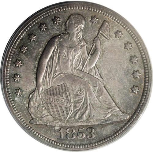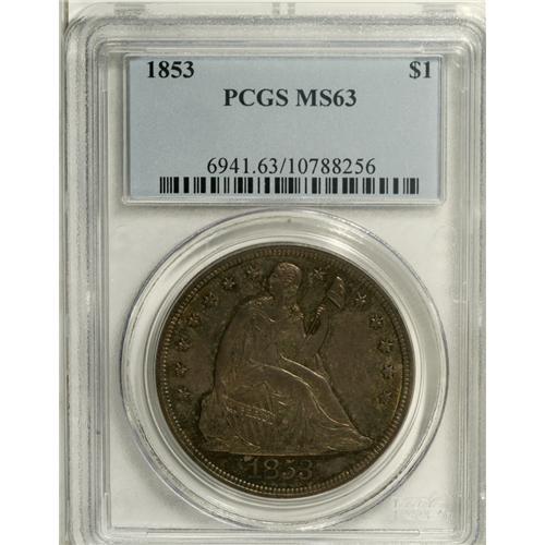 <B>1853 S$1 MS63 PCGS.</B></I> This Select Mint State example offers lovely orange-gold toning over steel-gray surfaces, with a fair strike and fewer signs of contact than might be expected for the grade. It is perhaps only the subdued luster that keeps this piece from a finer grade. The 1853 weight reduction in minor silver coinage did not apply to the silver dollar, whether by commission or omission, and because they were worth more as bullion than as coins, examples failed to circulate. Population: 27 in 63, 9 finer (1/07).<BR><BR><b>Shipping:</b> Coins & Currency (<a target="_blank" href="http://www.heritageauctions.com/common/shipping.php">view shipping information</a>)