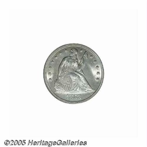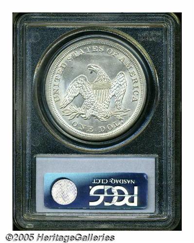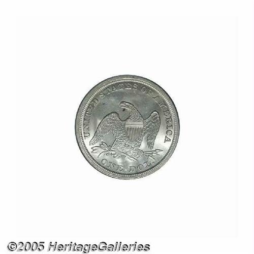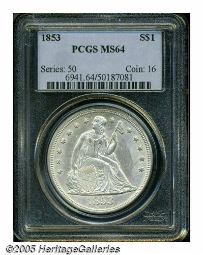 <B>1853<S$1> MS64 PCGS.</B></I> The 1853 is one of the more available of the No Motto Seated Dollars in Uncirculated grades. The quantity of survivors at that level, however, is still quite low due to widespread circulation and heavy melting. This fully lustrous survivor is essentially untoned. The strike is well executed save for the normal softness on the right (facing) obverse stars and the top of the eagle's right wing. A few scattered marks on the obverse portrait, including an unobtrusive pinscratch on Liberty's right leg, appear to be the primary grade limiting factor. Population: 7 in 64, 1 finer (6/05).