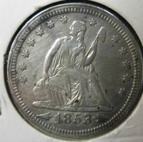 1853 SEATED LIBERTY QUARTER. AU-50.