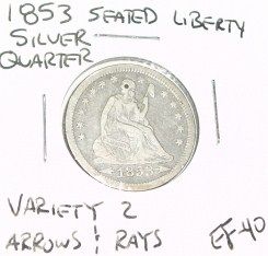 1853 SEATED LIBERTY SILVER QUARTER DOLLAR VARIETY 2 ARROWS & RAYS *RARE EXTRA FINE-40 GRADE* HARD TO FIND COIN!! ***Coin & Currency Grades, Conditions and Values are not Northern Colorado Estate Liquidators Responsibilty. Grades, Condition and Values are determined by Consigner(s) & Buyers ONLY***