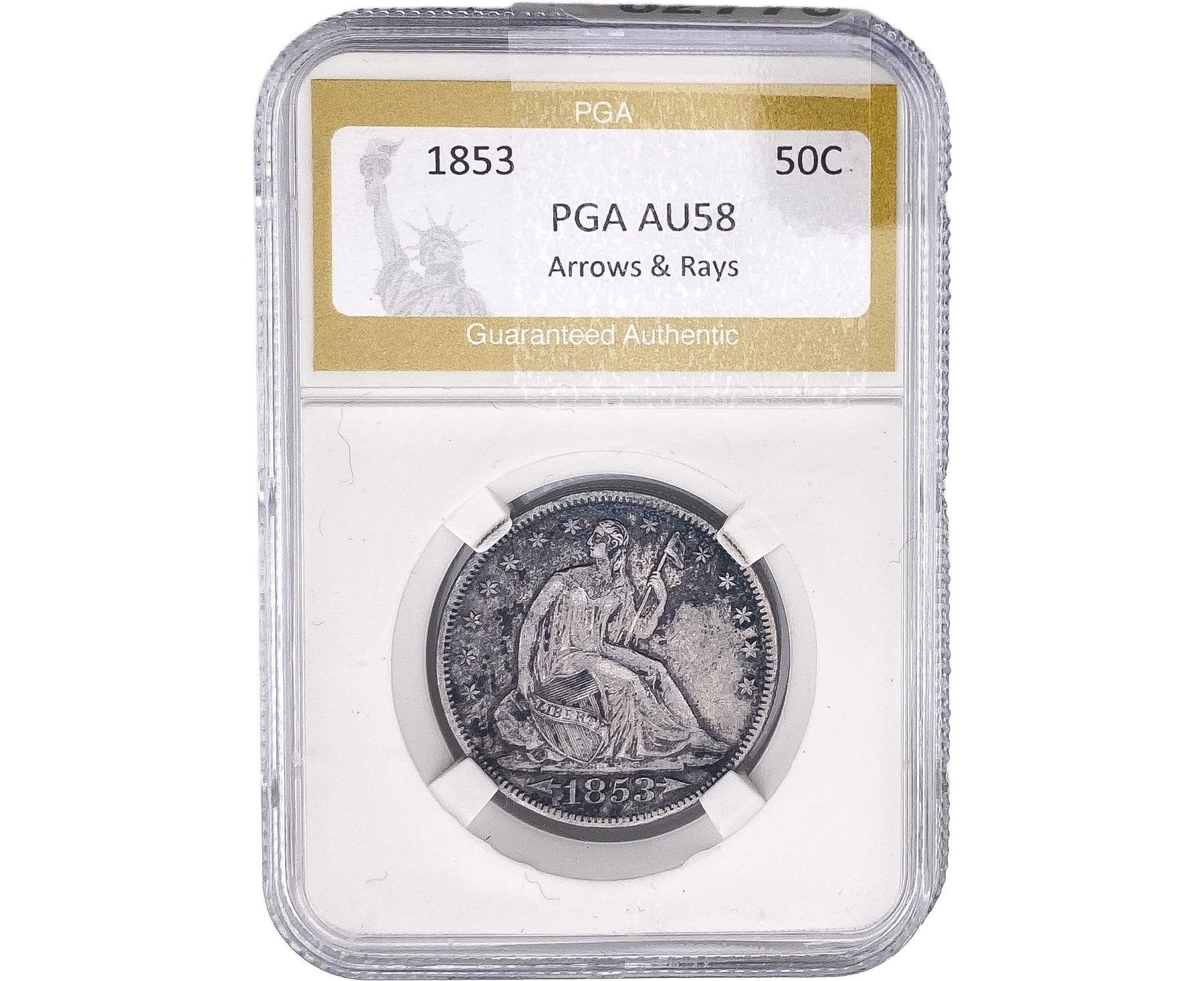 1853 Seated Liberty Half Dollar PGA AU58 Arrows/Rays