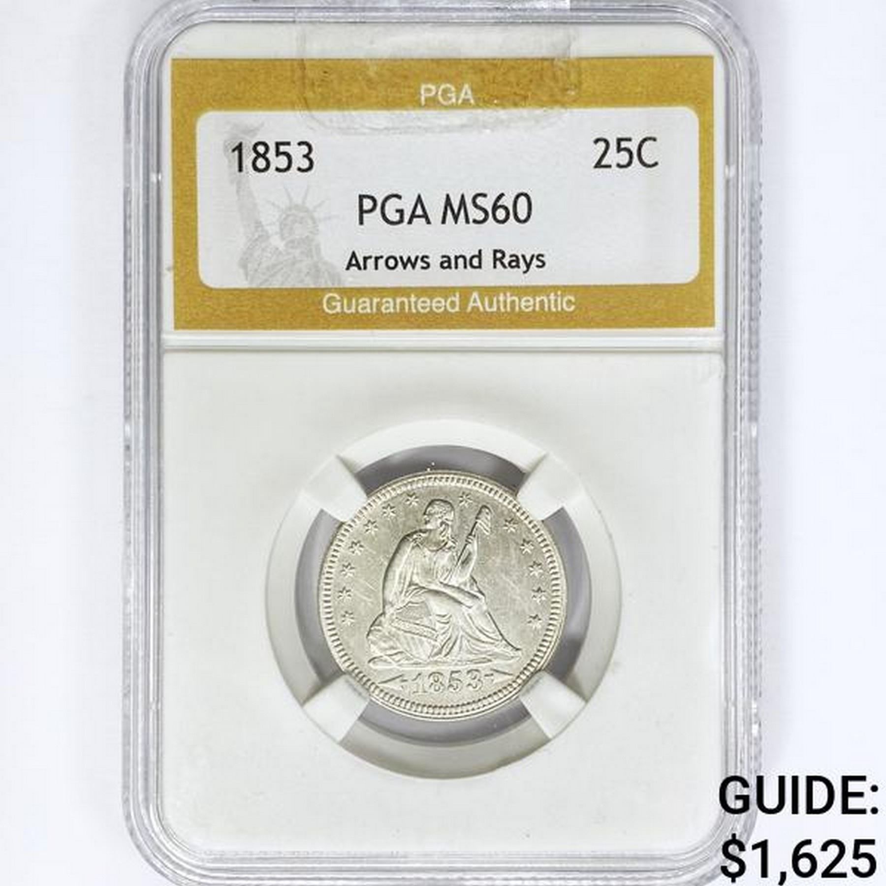 1853 Seated Liberty Quarter PGA MS60 Arrows & Rays