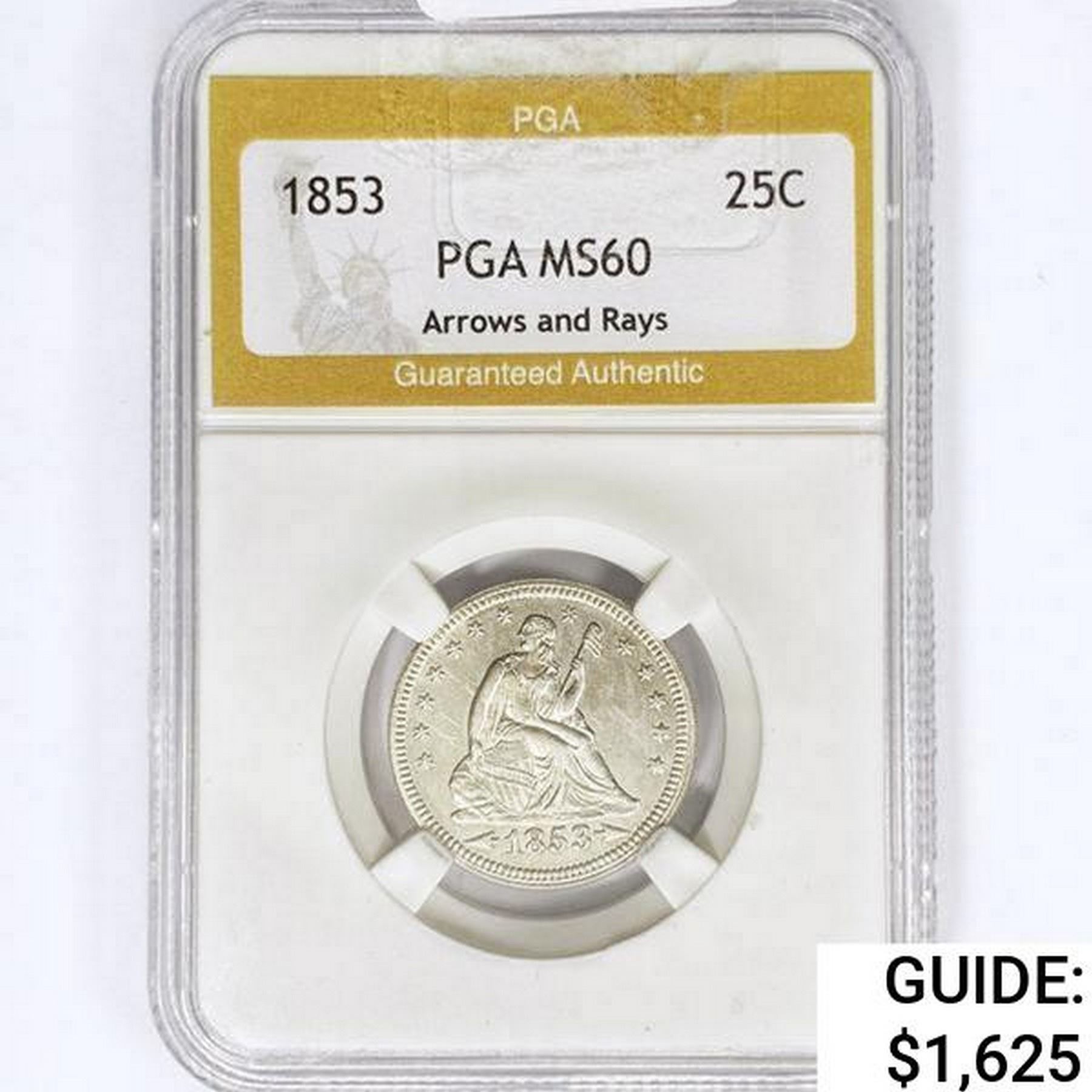1853 Seated Liberty Quarter PGA MS60 Arrows & Rays