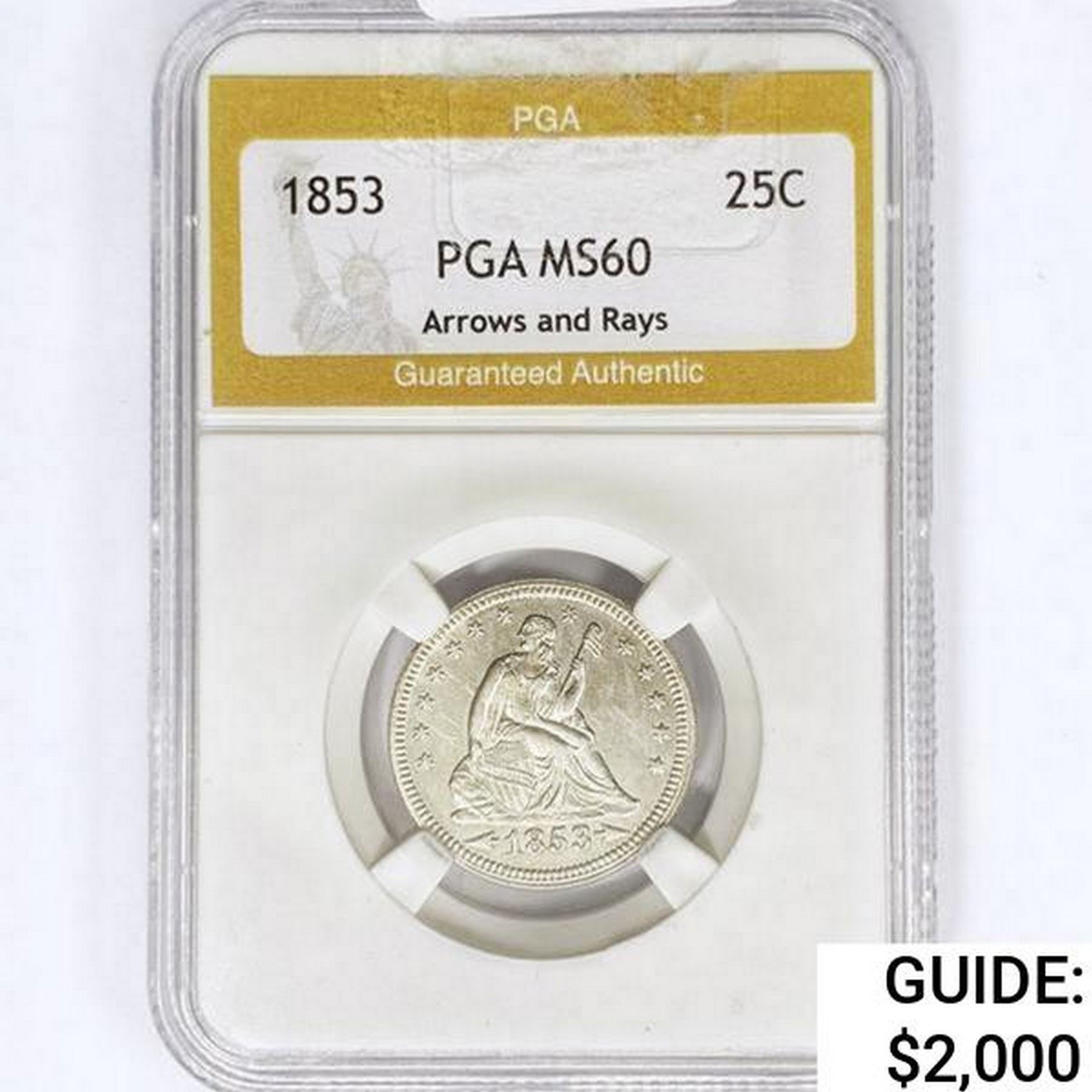 1853 Seated Liberty Quarter PGA MS60 Arrows & Rays