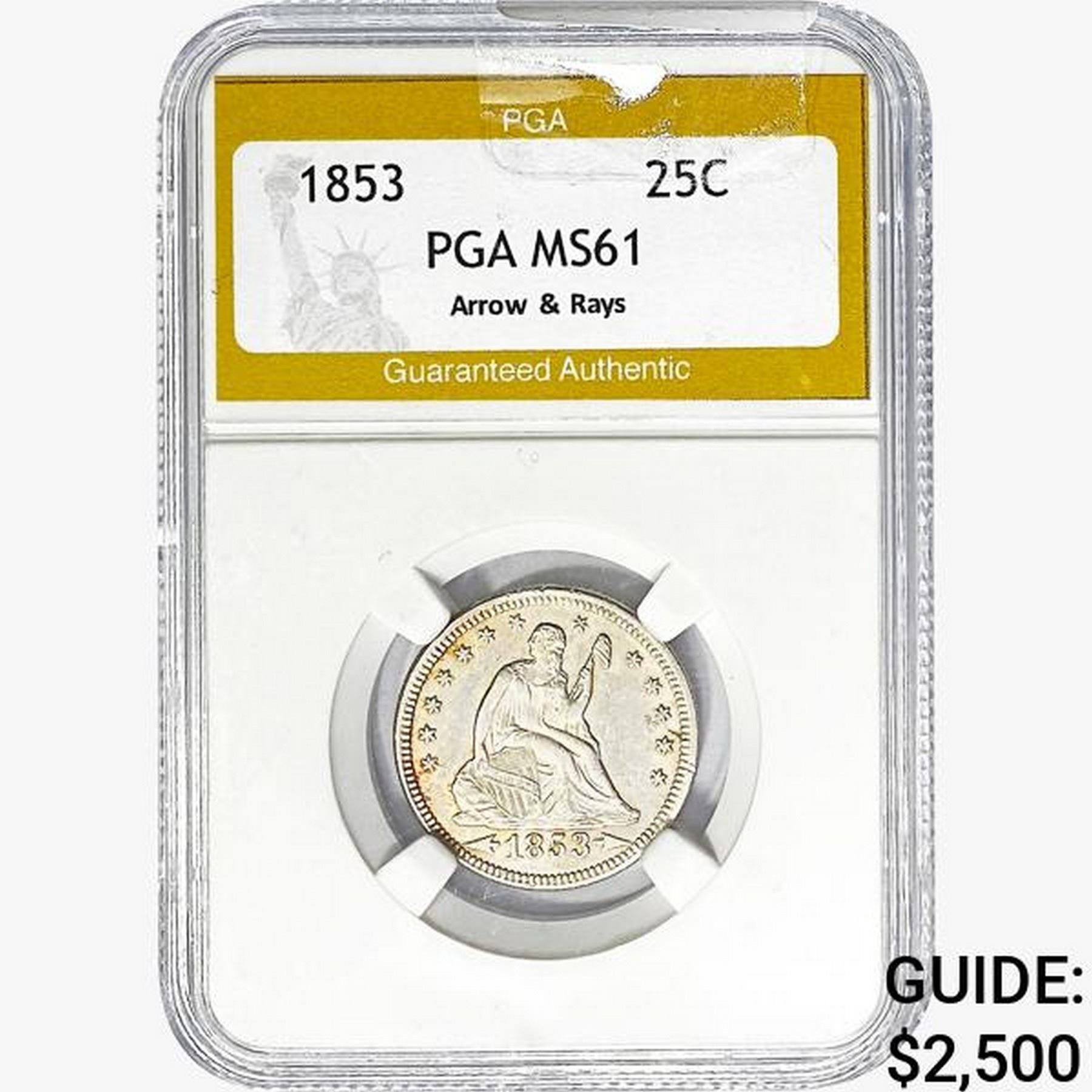 1853 Seated Liberty Quarter PGA MS61 ARR. & RAYS