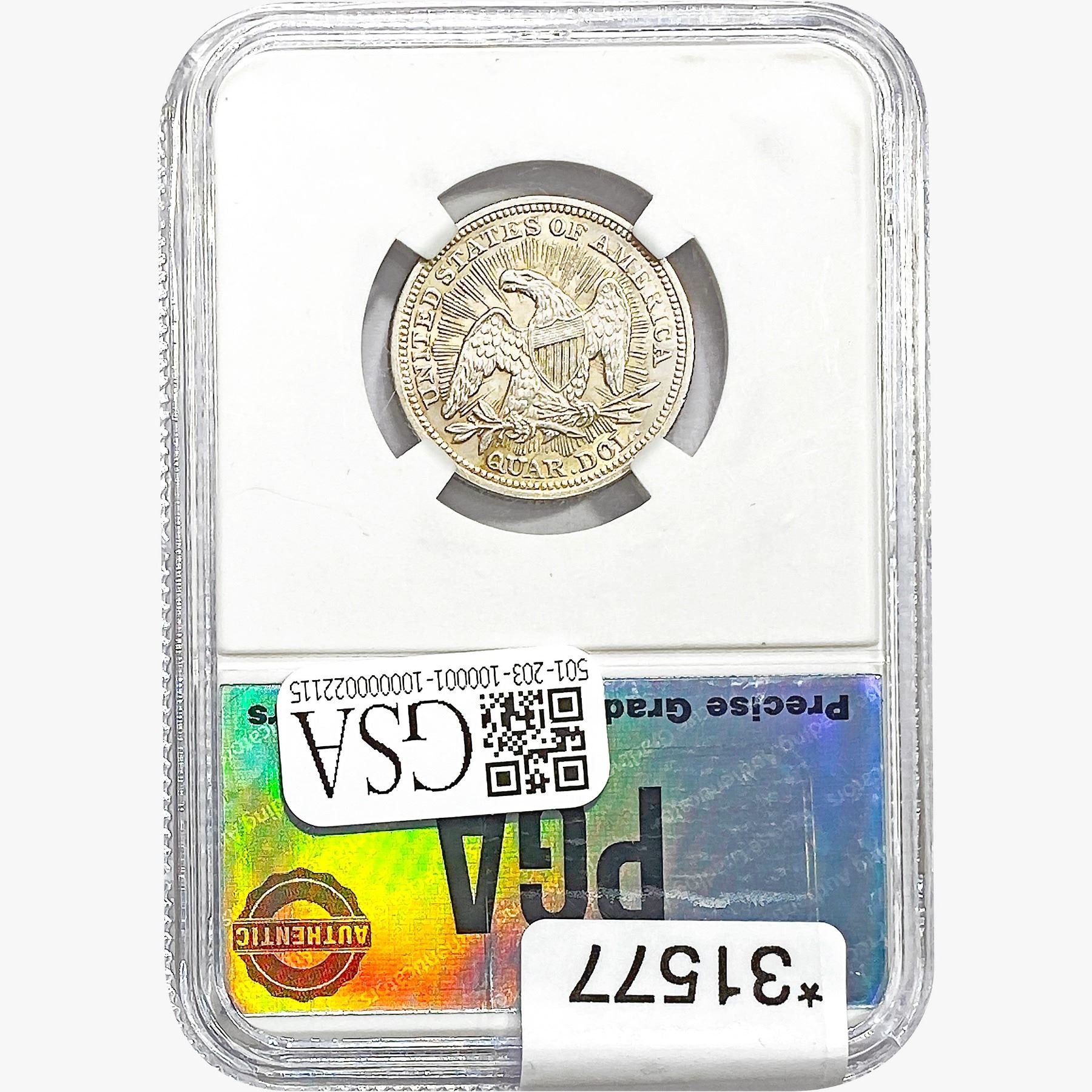 COINS AND CURRENCY LISTED IN GSA’S CATALOG AS GRADED AND ENCAPSULATED BY PCGS, NGC, ANACS, ICG, PCGS CURRENCY, PMG, PCGS BANKNOTE GRADING, CMC OR ANY OTHER THIRD-PARTY GRADING SERVICE ARE LIKEWISE SOLD “AS-IS” EXCEPT AS EXPRESSLY SET FORTH HEREIN. ALL THIRD-PARTY GRADING SERVICE GUARANTEES, INCLUDING AUTHENTICITY, ARE THE SOLE RESPONSIBILITY OF THE THIRD-PARTY GRADING SERVICE AND NOT WARRANTIES OR GUARANTEES OF GSA. BIDDERS SHOULD CONTACT THESE THIRD-PARTY GRADING SERVICES DIRECTLY WITH RESPECT TO ANY CLAIMS OR QUESTIONS THEY MAY HAVE CONCERNING THEIR GUARANTEES AND WARRANTIES. BIDDERS ACKNOWLEDGE AND AGREE THAT AUCTIONEER IS NOT BOUND BY OR LIABLE FOR ANY OPINION OR CERTIFICATION BY ANY THIRD-PARTY GRADING SERVICE. REMOVAL OF A PRODUCT FROM ITS PROTECTIVE CASING OR HOLDER OR ALTERATION OF ANY COIN HOLDER WAIVES ALL RIGHTS CONCERNING THE PRODUCT CONTAINED THEREIN.