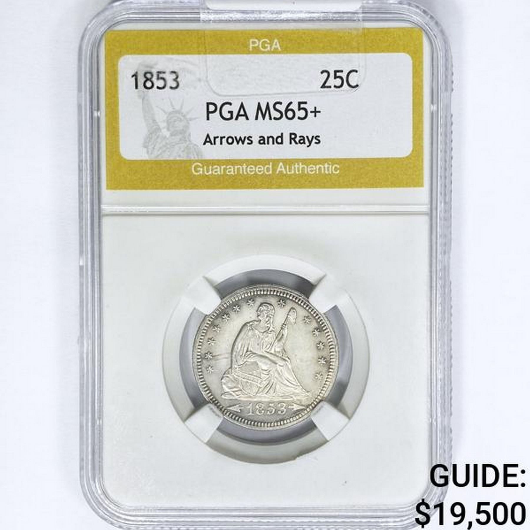 1853 Seated Liberty Quarter PGA MS65+ ARWS & Rays