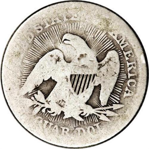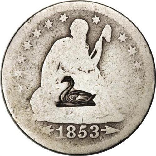 <B>1853 Seated Liberty Quarter With Bird Counterstamp.</B></I> 1853 Arrows and Rays Seated quarter with a bird counterstamp on the obverse, a really worn coin.<BR><BR><b>Shipping:</b> Coins & Currency (<a target="_blank" href="http://www.heritageauctions.com/common/shipping.php">view shipping information</a>)