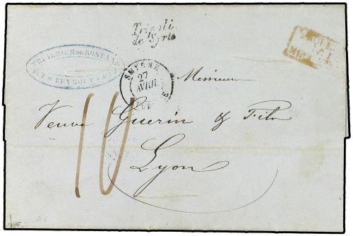 1853 Stamp-less envelope to FRANCE written from BEYROUTH and cancelled by the French Post Office Tripoli de Syrie (Pothion Type A), charged "10", routed via Smyrne with boxed PAQUEBOTS DE LA MEDITERRANEE in red with disinfection slits for cholera and LYON arrival on reverse. Very rare item of Levant mail.