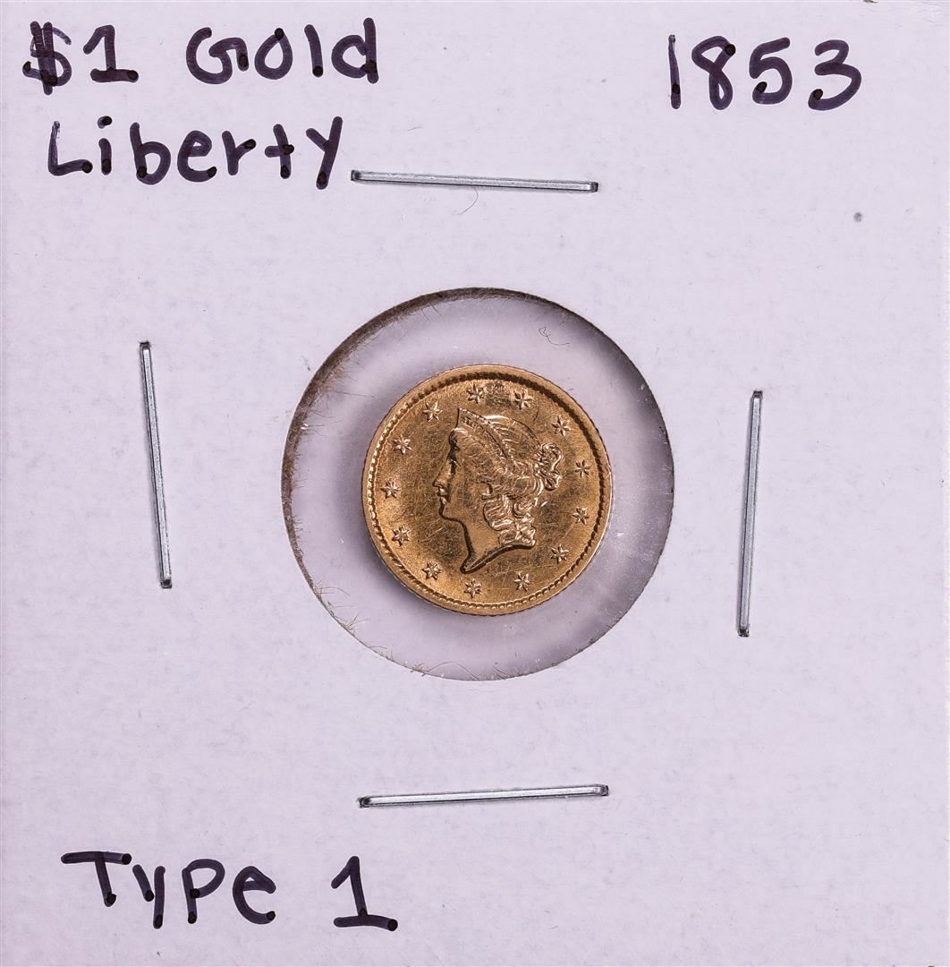 One 1853 Type 1 $1 Liberty Head Gold Dollar Coin.