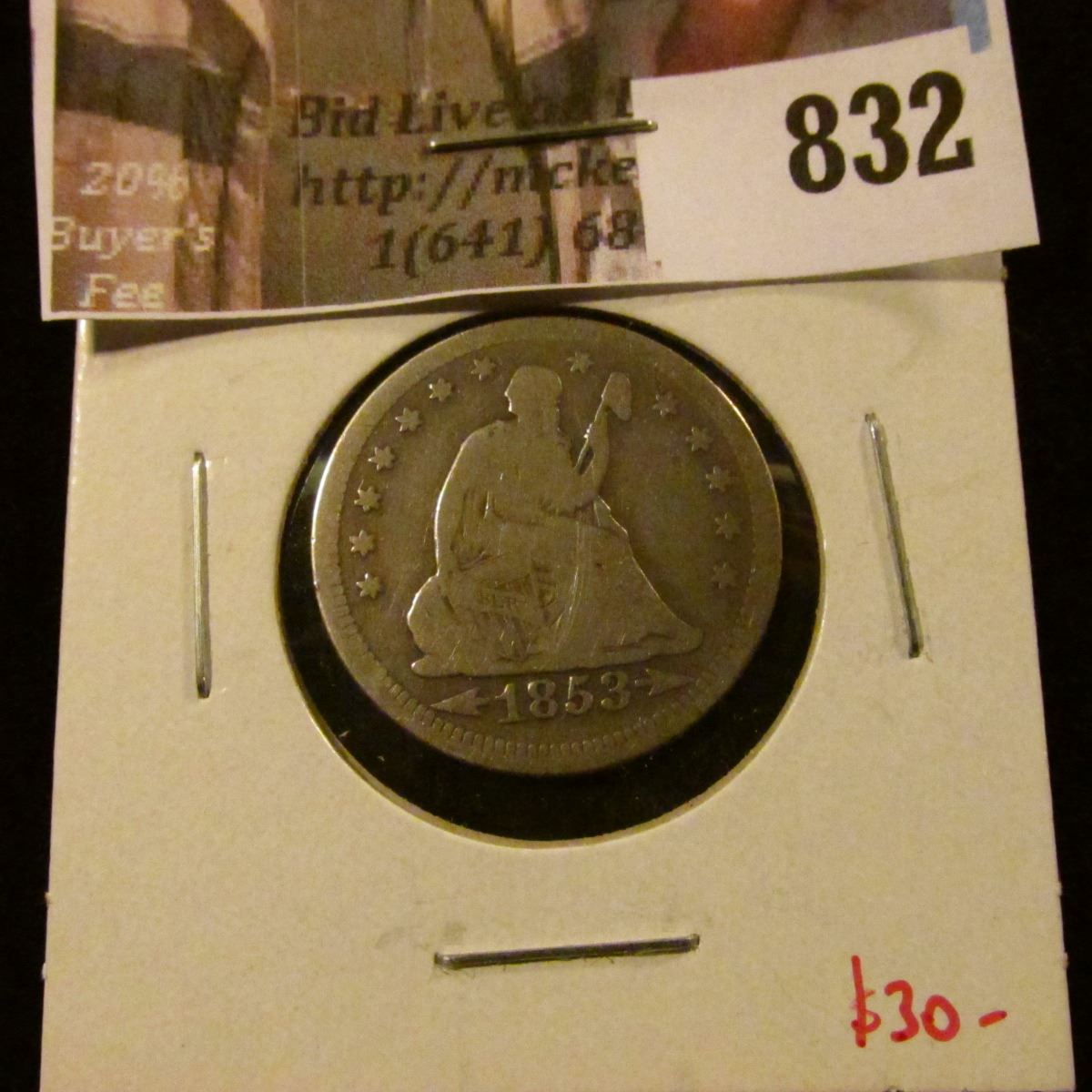 1853 arrows Seated Liberty Quarter, VG, value $30