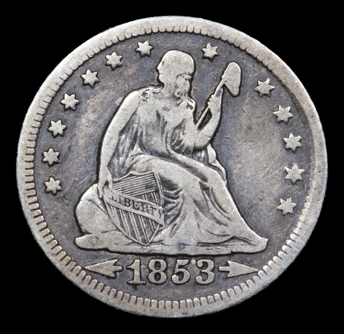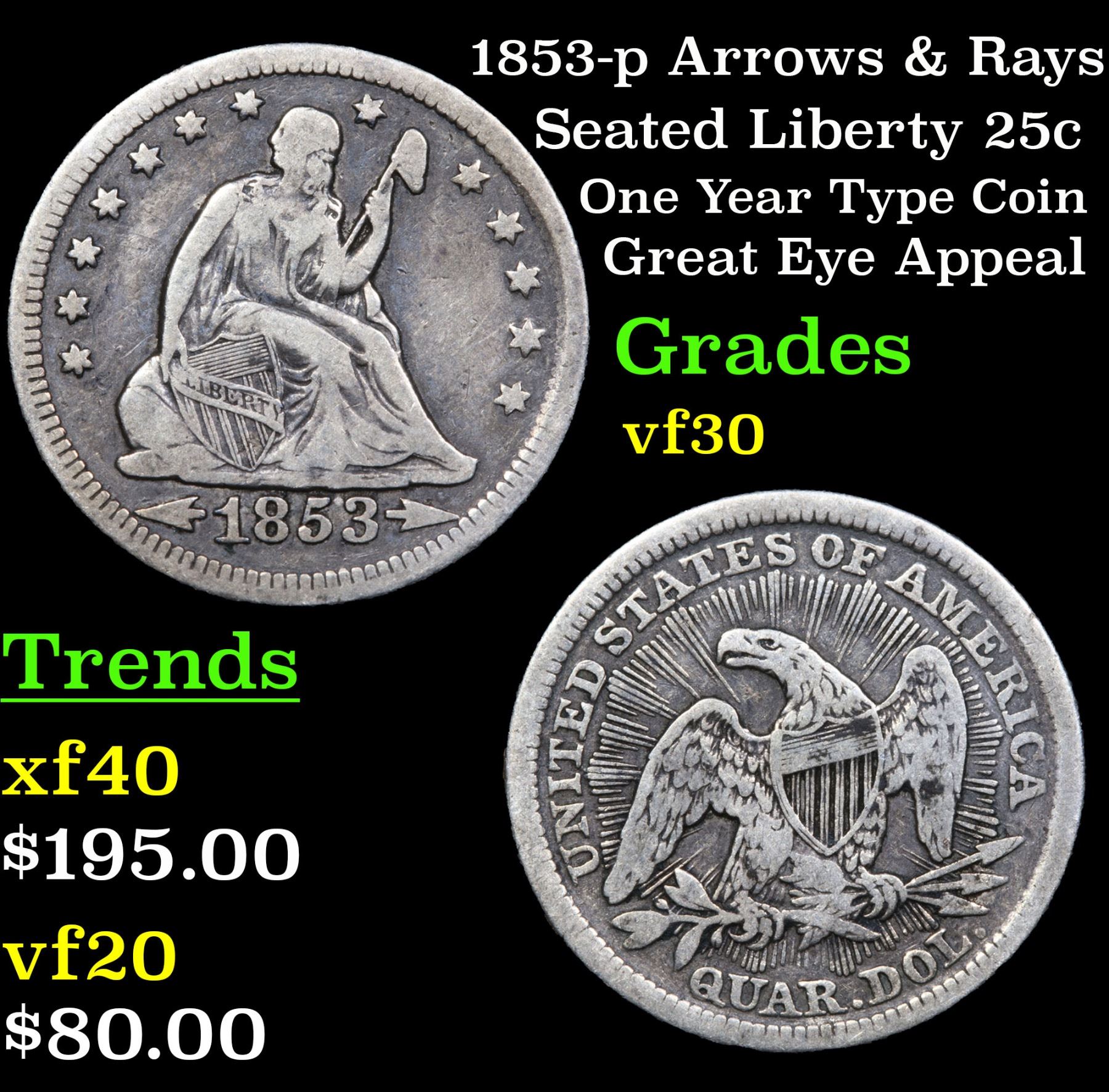 1853-p Arrows & Rays One Year Type Coin Great Eye Appeal Seated Liberty Quarter 25c Grades vf++.
