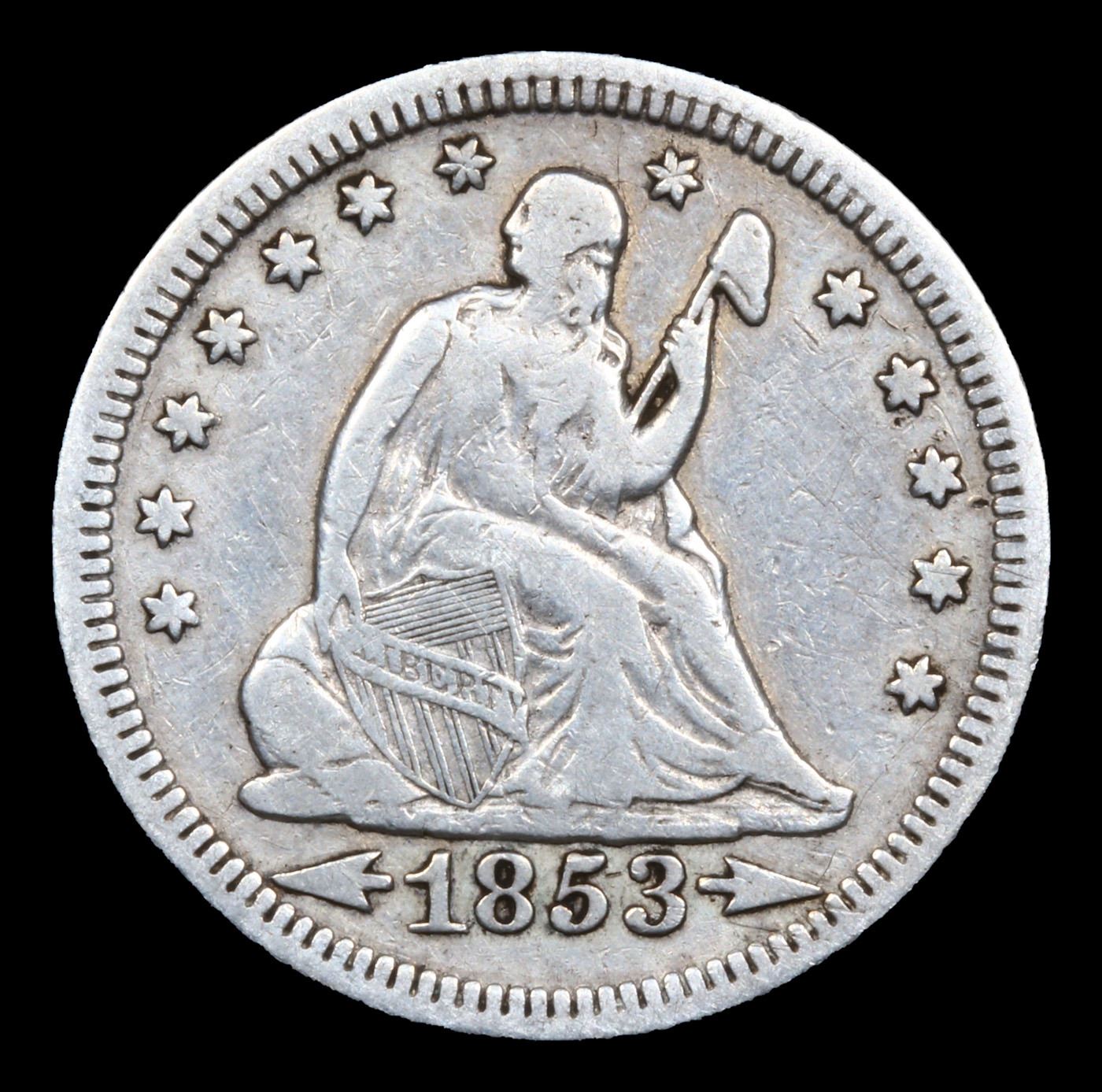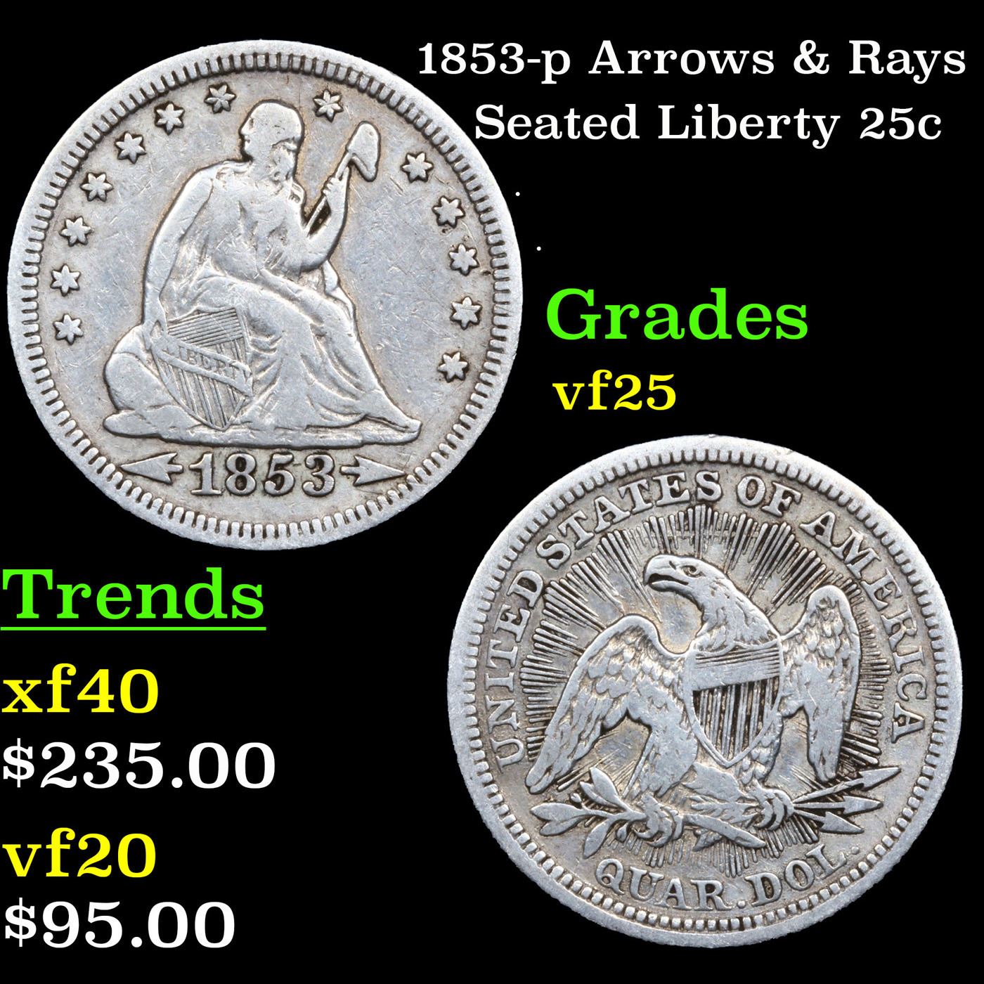 1853-p Arrows & Rays Seated Liberty Quarter 25c Grades vf+.