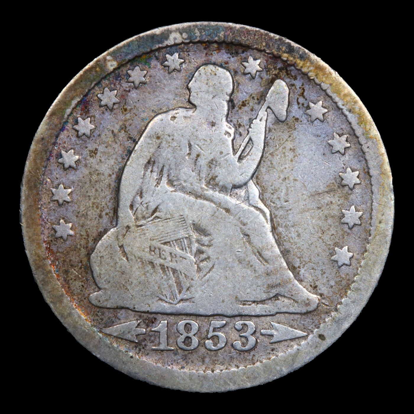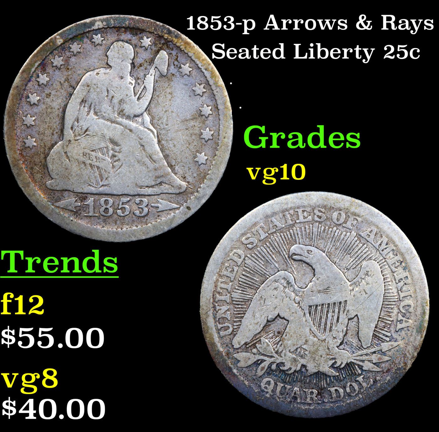 1853-p Arrows & Rays Seated Liberty Quarter 25c Grades vg+.