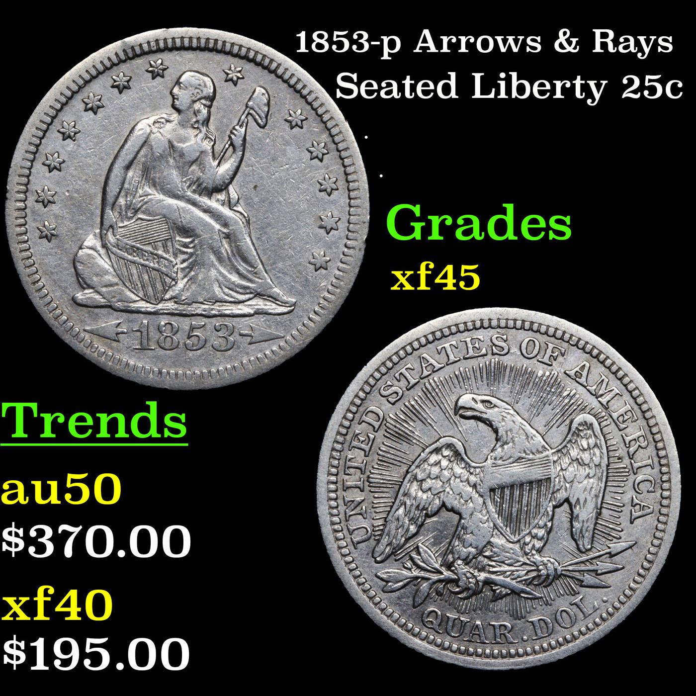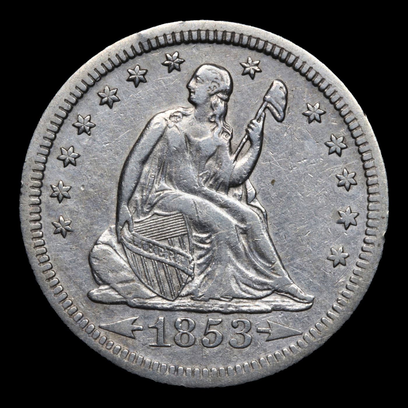 1853-p Arrows & Rays Seated Liberty Quarter 25c Grades xf+.