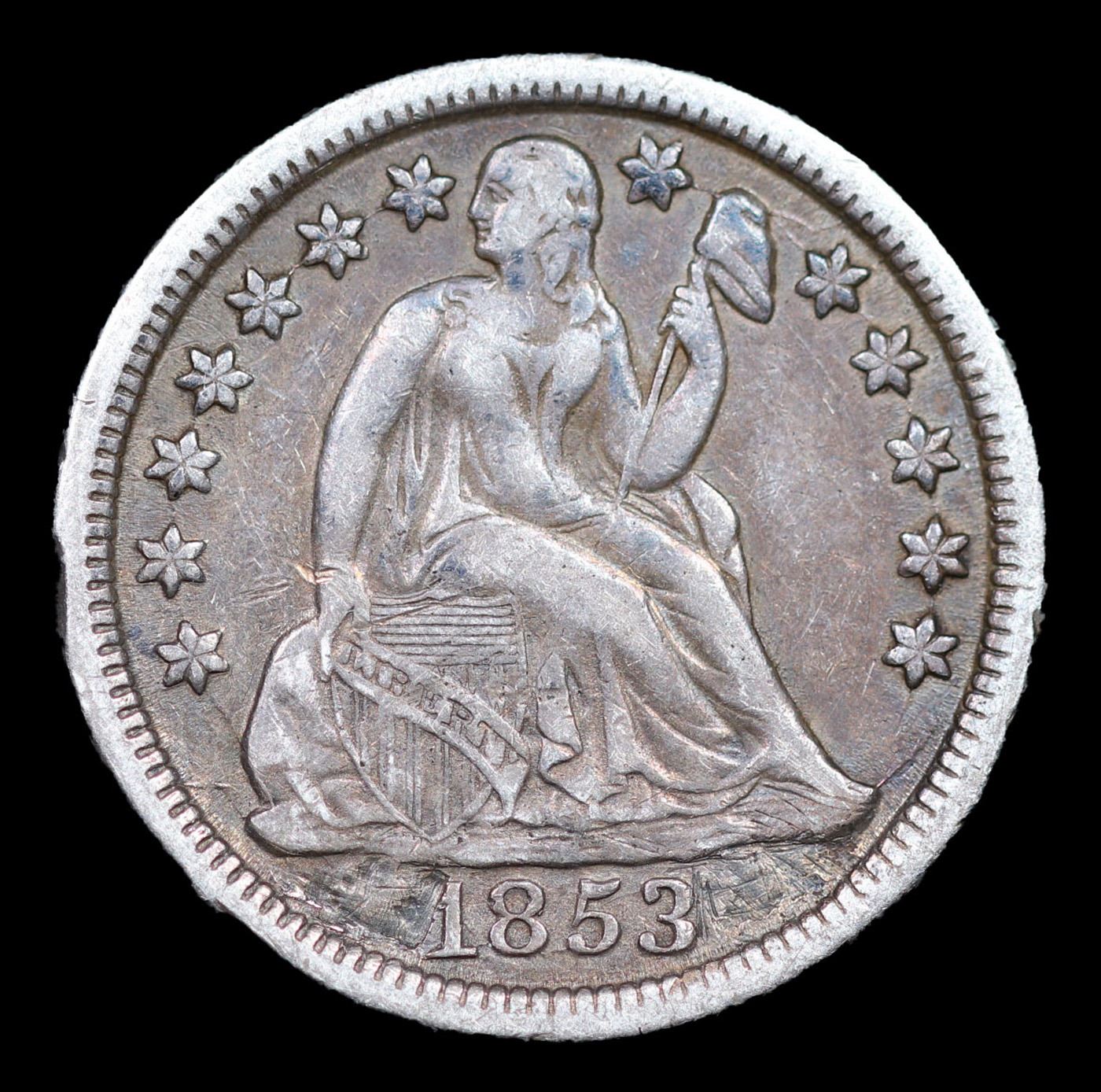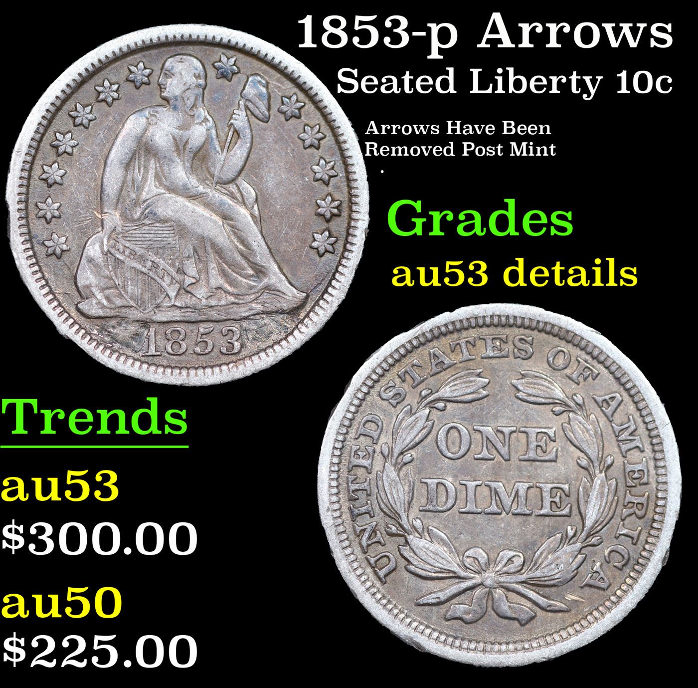 1853-p Arrows Seated Liberty Dime 10c Grades AU Details.