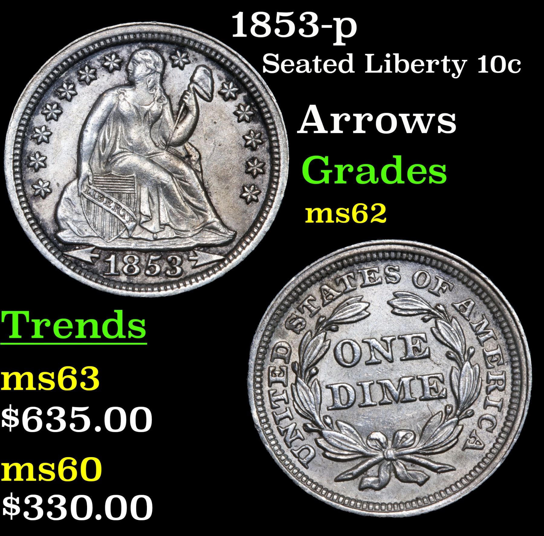 1853-p Arrows . Seated Liberty Dime 10c Grades Select Unc.