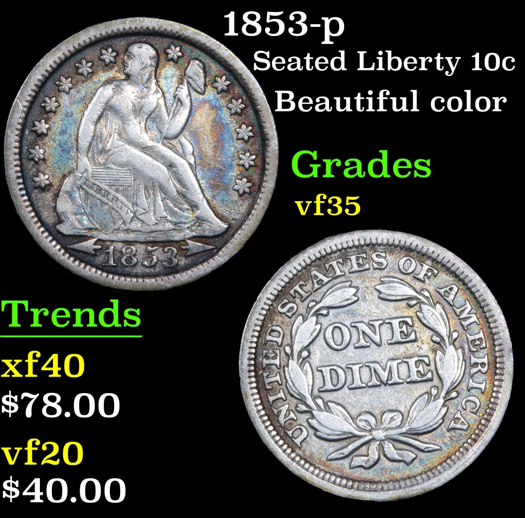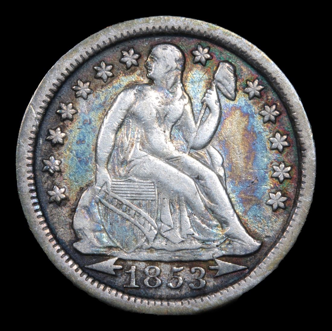 1853-p Seated Liberty Dime 10c Grades vf++. Beautiful color A Corey's Pick
