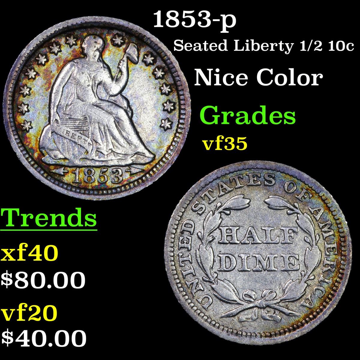 1853-p Nice Color . Seated Liberty Half Dime 1/2 10c Grades vf++.