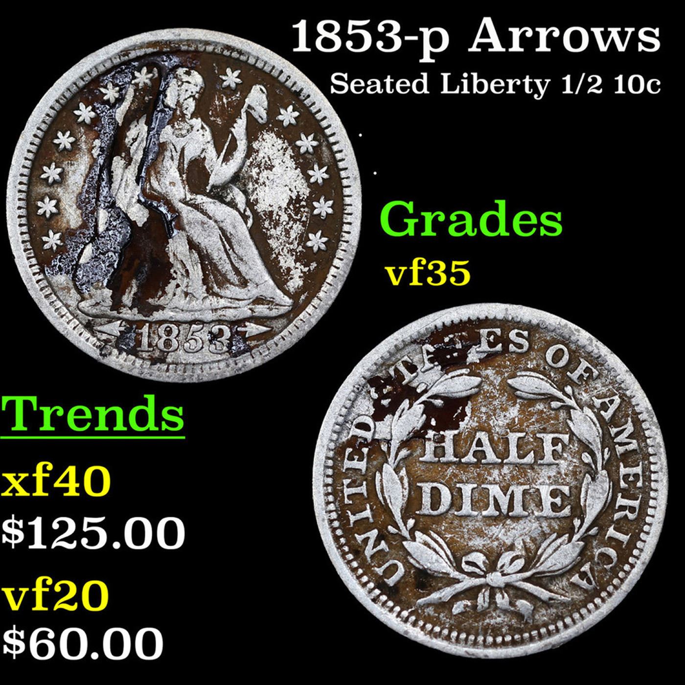 1853-p Arrows Seated Liberty Half Dime 1/2 10c Grades vf++.