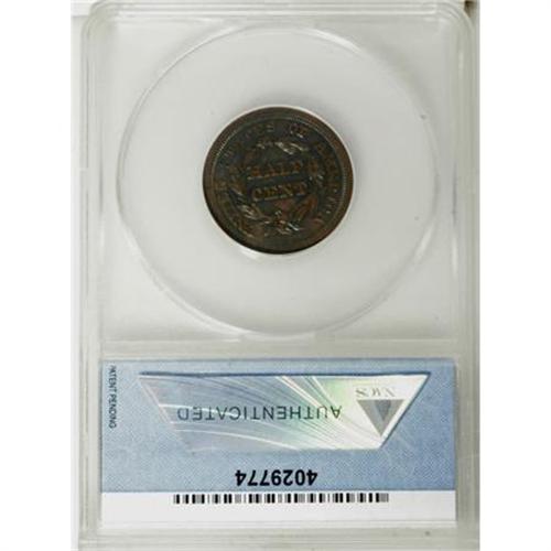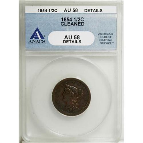 <B>1854 1/2 C --Cleaned--ANACS. AU58 Details.</B></I> NGC Census: (37/349). PCGS Population (31/228). Mintage: 55,358. Numismedia Wsl. Price for NGC/PCGS coin in AU58: $142. (#1230)<BR><BR><B>Coin Engraver:</B> Christian Gobrecht<BR><BR><b>Shipping:</b> Coins & Currency (<a target="_blank" href="http://www.heritageauctions.com/common/shipping.php">view shipping information</a>)