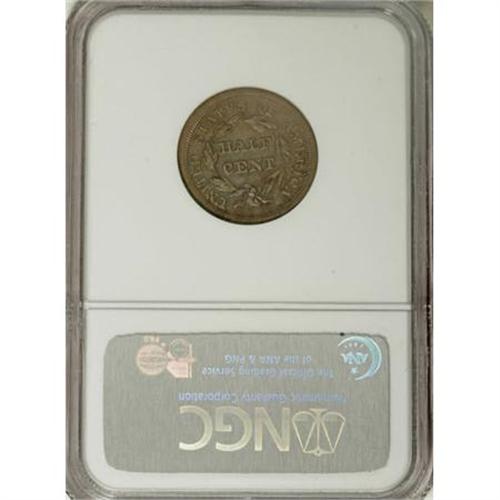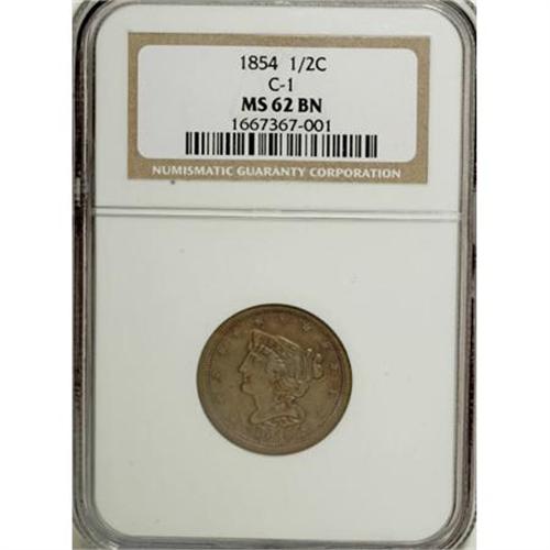 <B>1854 1/2 C MS62 Brown NGC.</B></I> C-1. NGC Census: (68/256). PCGS Population (45/159). Mintage: 55,358. Numismedia Wsl. Price for NGC/PCGS coin in MS62: $192. (#1230)<BR><BR><B>Coin Engraver:</B> Christian Gobrecht<BR><BR><b>Shipping:</b> Coins & Currency (<a target="_blank" href="http://www.heritageauctions.com/common/shipping.php">view shipping information</a>)