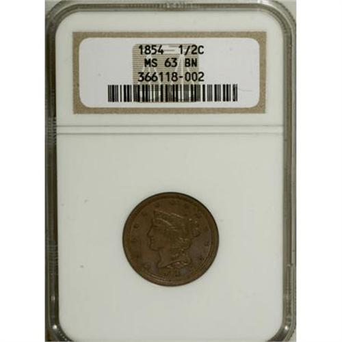 <B>1854 1/2 C MS63 Brown NGC.</B></I> NGC Census: (102/148). PCGS Population (89/61). Mintage: 55,358. Numismedia Wsl. Price for NGC/PCGS coin in MS63: $267. (#1230)<BR><BR><B>Coin Engraver:</B> Christian Gobrecht<BR><BR><b>Shipping:</b> Coins & Currency (<a target="_blank" href="http://www.heritageauctions.com/common/shipping.php">view shipping information</a>\)