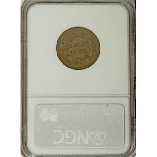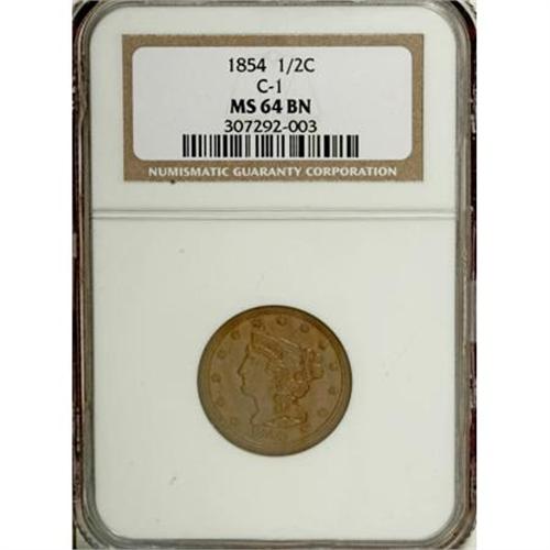 <B>1854 1/2 C MS64 Brown NGC.</B></I> C-1. NGC Census: (98/52). PCGS Population (54/12). Mintage: 55,358. Numismedia Wsl. Price for NGC/PCGS coin in MS64: $360. (#1230)<BR><BR><B>Coin Engraver:</B> Christian Gobrecht<BR><BR><b>Shipping:</b> Coins & Currency (<a target="_blank" href="http://www.heritageauctions.com/common/shipping.php">view shipping information</a>)