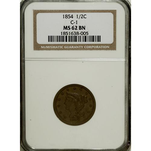 1854 1/2 C MS62 Brown NGC. C-1. NGC Census: (132/4