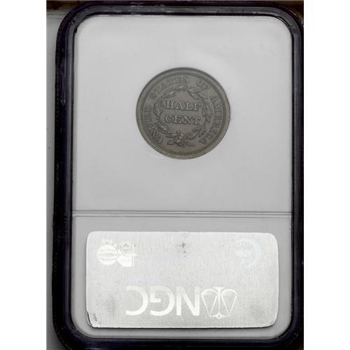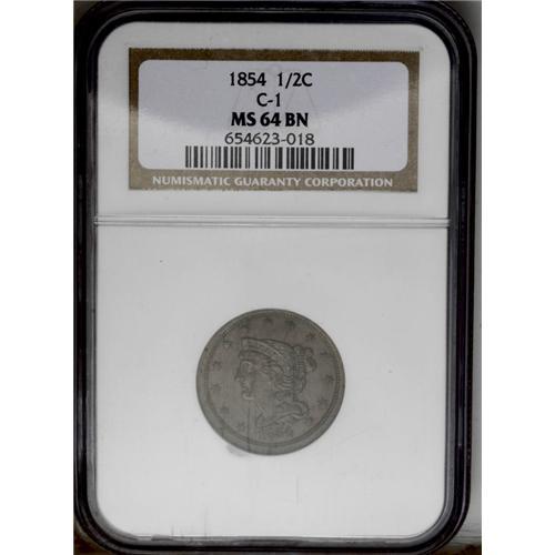 <B>1854<1/2 C> MS64 Brown NGC.</B></I> C-1, B-1, R.1. This exquisitely struck medium brown representative is impressive for the grade despite a trace of a fingerprint near the coronet tip. Two tiny spots are seen on the rim at 3 and 10 o'clock. EAC 55.