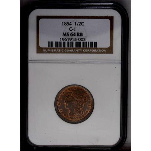 1854 1/2 C MS64 Red and Brown NGC. B-1, C-1, R.1. Brig