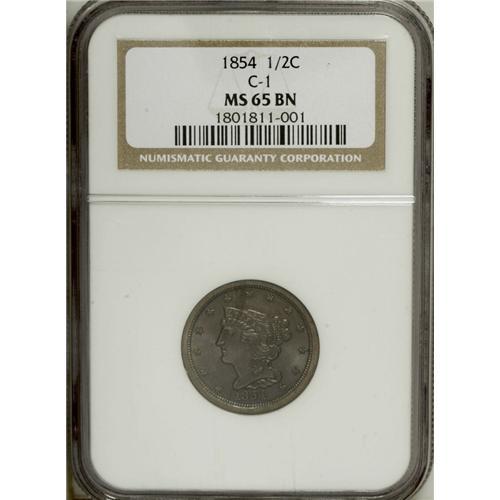 1854 1/2 C MS65 Brown NGC. C-1, B-1, R.1. Pleasing glo