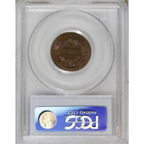<B>1854 1/2 C MS65 Brown PCGS.</B></I> C-1, B-1, R.1. Natural patination seems to slightly subdue the satiny luster on this medium chocolate-brown half cent. To the naked eye, only a couple of small marks are visible, but upon closer examination they appear to be minor strike-through errors, perhaps lint. A well struck and attractive little sister. Population: 11 in 65, 1 finer (12/07). EAC 60.<BR><BR><B>Coin Engraver:</B> Christian Gobrecht<BR><BR><b>Shipping:</b> Coins & Currency (<a target="_blank" href="http://www.heritageauctions.com/common/shipping.php">view shipping information</a>)
