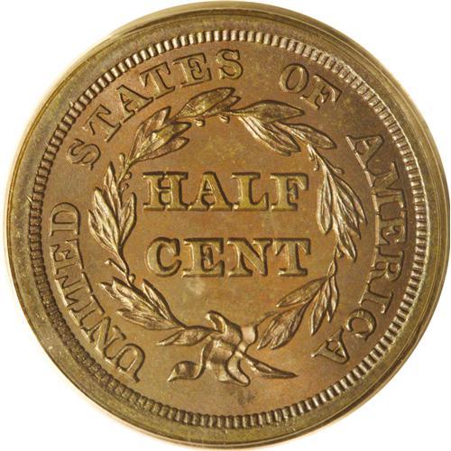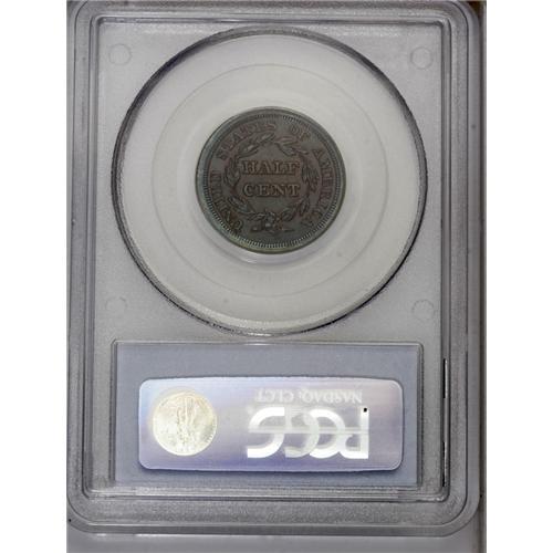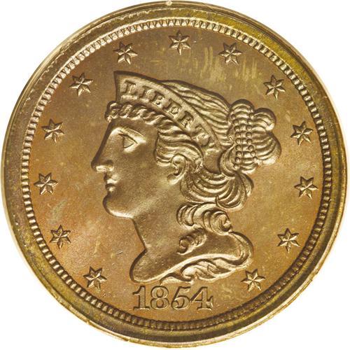 <B>1854<1/2 C> MS66 Brown PCGS.</B></I> C-1, B-1, R.1. Sharply defined throughout and well centered on the planchet. A pleasant mixture of deep brick-red, blue-green, and tan-brown patina blankets each side with excellent underlying luster. A superior type coin for the copper collector. EAC 60. Population: 1 in 66, 0 finer (7/06).