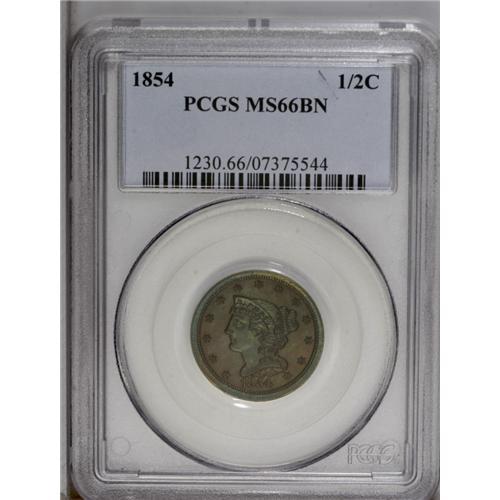 1854 1/2 C MS66 Brown PCGS. C-1, B-1, R.1. Sharply def