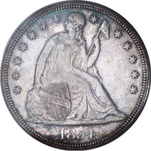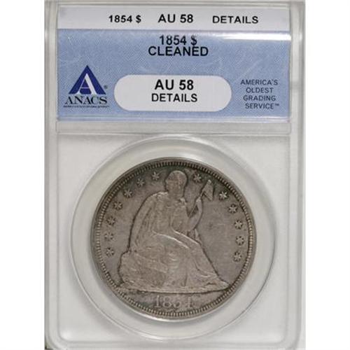 <B>1854 $1 --Cleaned--ANACS. AU58 Details.</B></I> The luminous surfaces, predominantly silver-gray on the obverse with elements of blue and violet on the reverse, have retoned from a past cleaning. The overall definition is solid, and only a few stray marks are present in the fields. A surprisingly attractive example, one of just 33,140 pieces struck, that shows just a touch of highpoint friction.<BR><I>Ex: Boyd, Brand & Ryder Sale, (Bowers and Merena, 3,90), lot 3885.<BR>From The John Stimson, Sr. Collection, Part One.</B></I><BR><BR><B>Coin Engraver:</B> Christian Gobrecht<BR><BR><b>Shipping:</b> Coins & Currency (<a target="_blank" href="http://www.heritageauctions.com/common/shipping.php">view shipping information</a>)