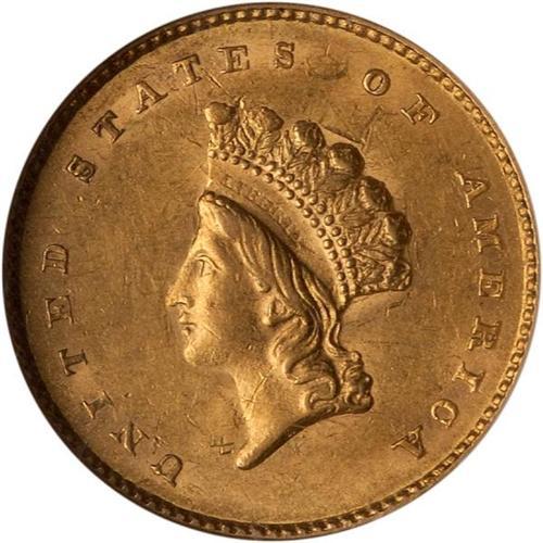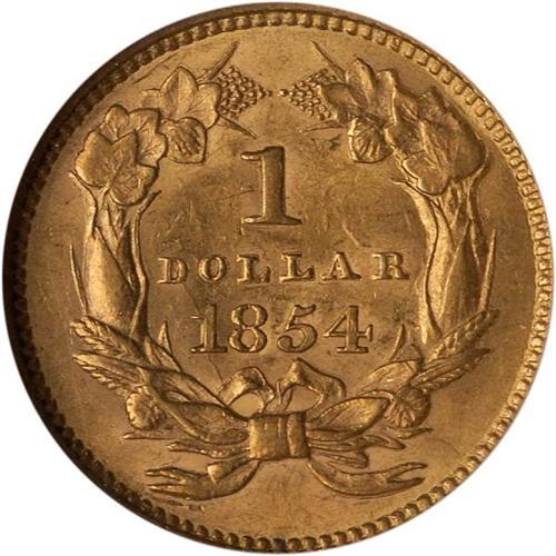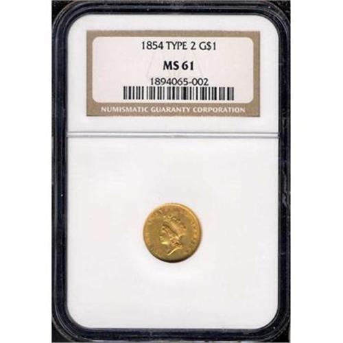 <b>1854 $1 Type 2 Gold Indian. NGC graded MS61.</b> This is a lovely, healthy-glowing Mint State, whose pleasing obverse and reverse color being naturally toned, beams with soft frosty luster. The dies left their most rigid impression behind with some unexceptional weakness or vagueness only at the center of Liberty's hair and on the 85 of the date <b>(PCGS # 7531)</b> <i>