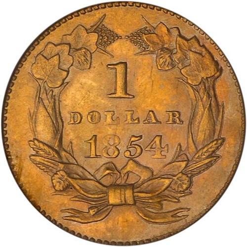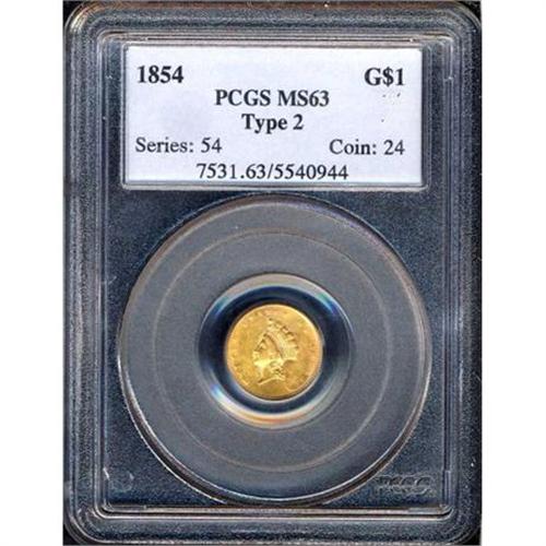 <b>1854 $1 Gold Indian. Type 2. PCGS graded MS63.</b> The fully brilliant example we now hand over bidders beats (from a technical angle) practically all of the Mint State 63 Type 2s that have passed through the various grading services. Unlike the usual survivor with its diminished impression on the hair, the date and portions of the wreath left by a weak blow of the (possibly worn) dies, this handsome coin is very sharp from top to bottom, center to periphery, with only the faintest trace of incompleteness on the 8 of the date.