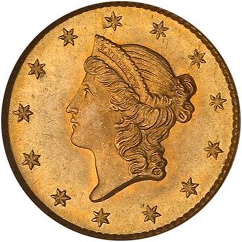 The stars on the Type 1 Liberty head gold dollar comprise a single uninterrupted circle around the coronet-crested head of Liberty. Contrary to the fashion of the period, where the date was invariably fixed below the head, on this denomination the designer, James Longacre, moved it to the reverse, inside the wreath.