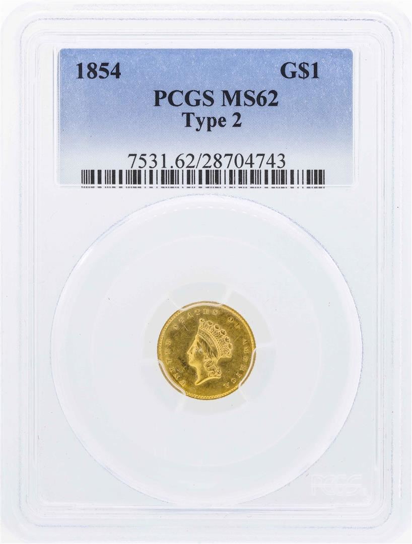 One 1854 $1 Indian Princess Gold Dollar Coin Type 2 PCGS MS62. PCGS Graded.