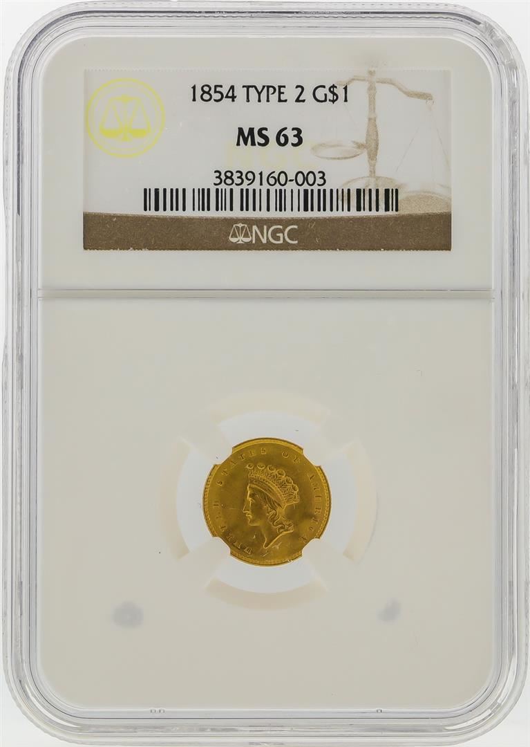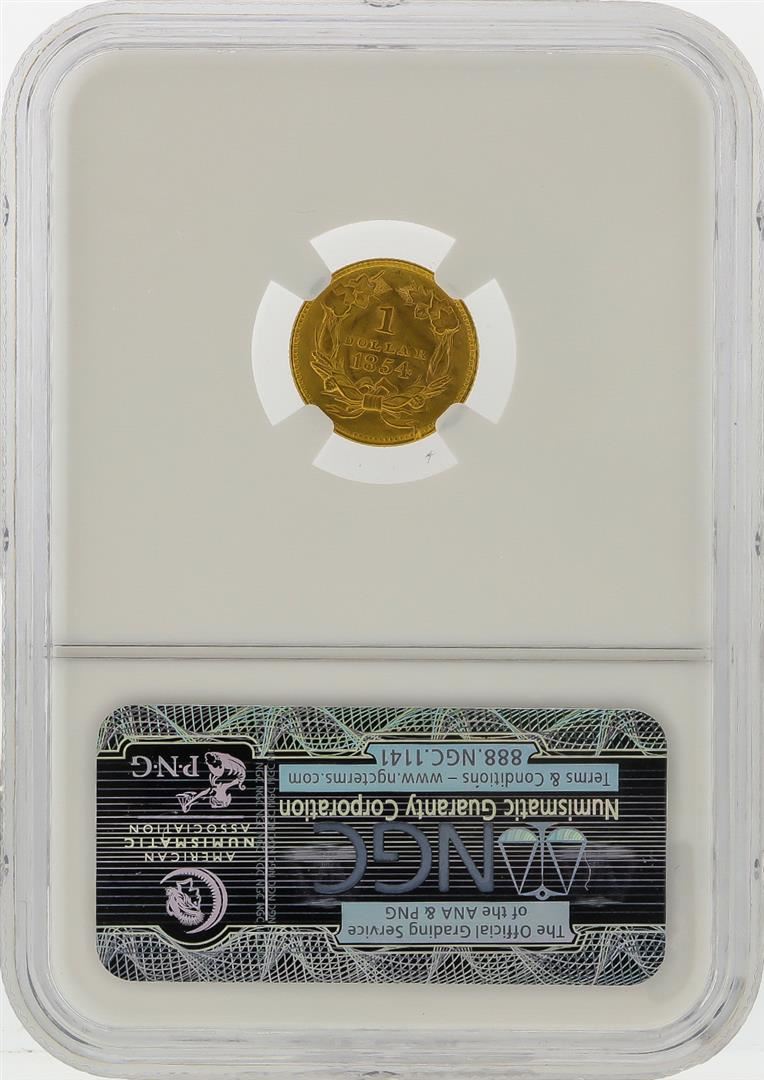 One 1854 $1 Indian Princess Head Gold Dollar Coin NGC MS63. NGC Certified.