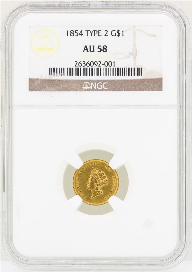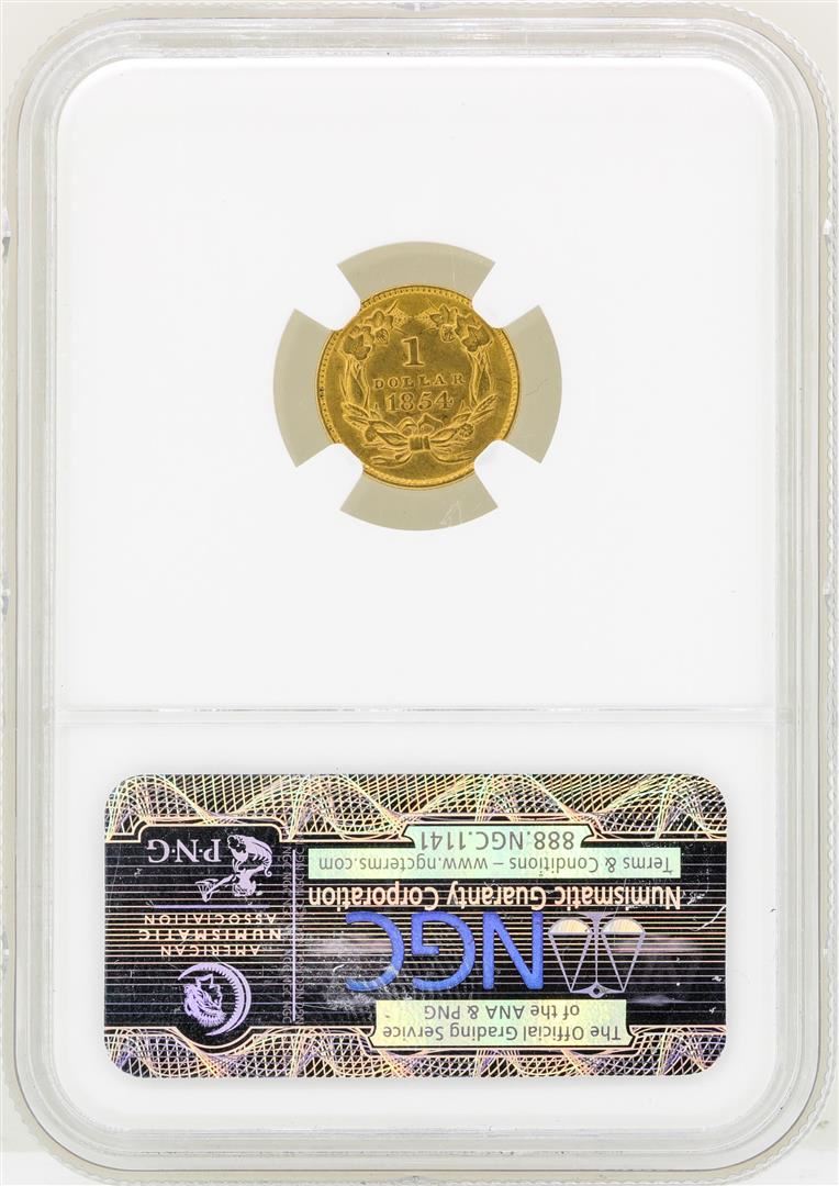 One 1854 $1 Indian Princess Head Gold Dollar Coin Type 2 NGC AU58. NGC Certified.