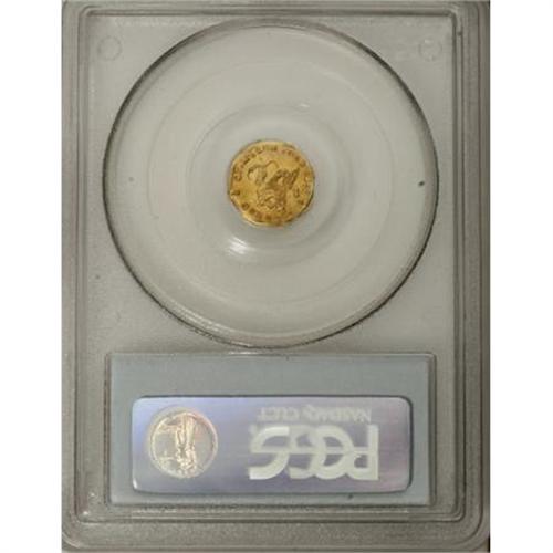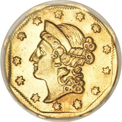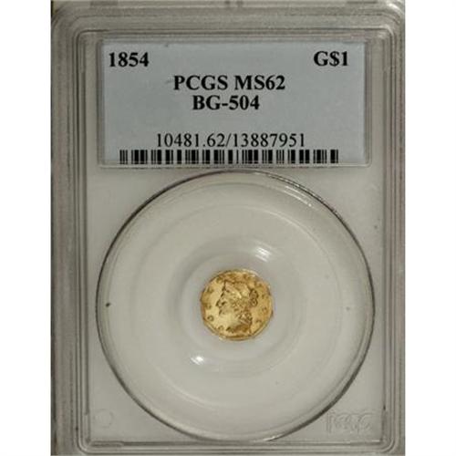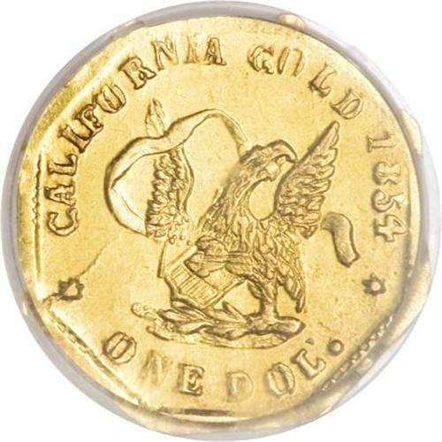 <B>1854 $1 Large Eagle Octagonal 1 Dollar, BG-504, Low R.5, MS62 PCGS.</B></I> State III. This Frontier, Deviercy & Co. Period One issue has a Large Head obverse that shows repolishing to remove clash marks. Moderate die rust appears on the obverse portrait. The obverse has orange-gold patina while the reverse is greenish-gold, and ample luster radiates from both sides. In this late die state, the reverse die crack extends from the star below CALIFORNIA to the scroll. Most examples of this variety are circulated; this piece is one of eight certified as MS62 at PCGS, with six finer (1/08). The same variety depicted on the cover of the Breen-Gillio standard reference, second edition, which states that this variety was "[Kenneth] Lee's favorite coin." <BR><BR><b>Shipping:</b> Coins & Currency (<a target="_blank" href="http://www.heritageauctions.com/common/shipping.php">view shipping information</a>)