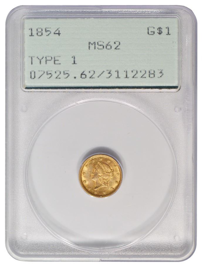 One 1854 $1 Liberty Head Gold Coin PCGS MS62.