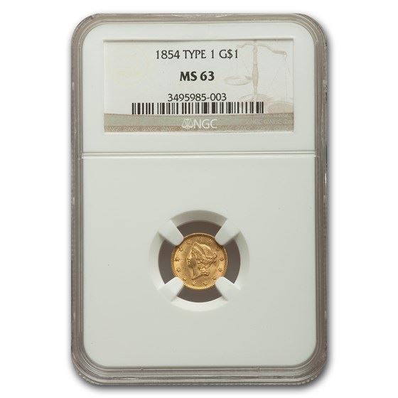 One piece 1854 $1 Liberty Head Gold MS-63 NGC