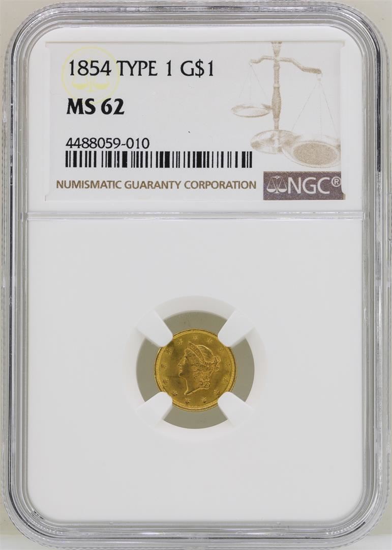 One 1854 $1 Liberty Head Type 1 Gold Dollar Coin NGC MS62. NGC Certified.